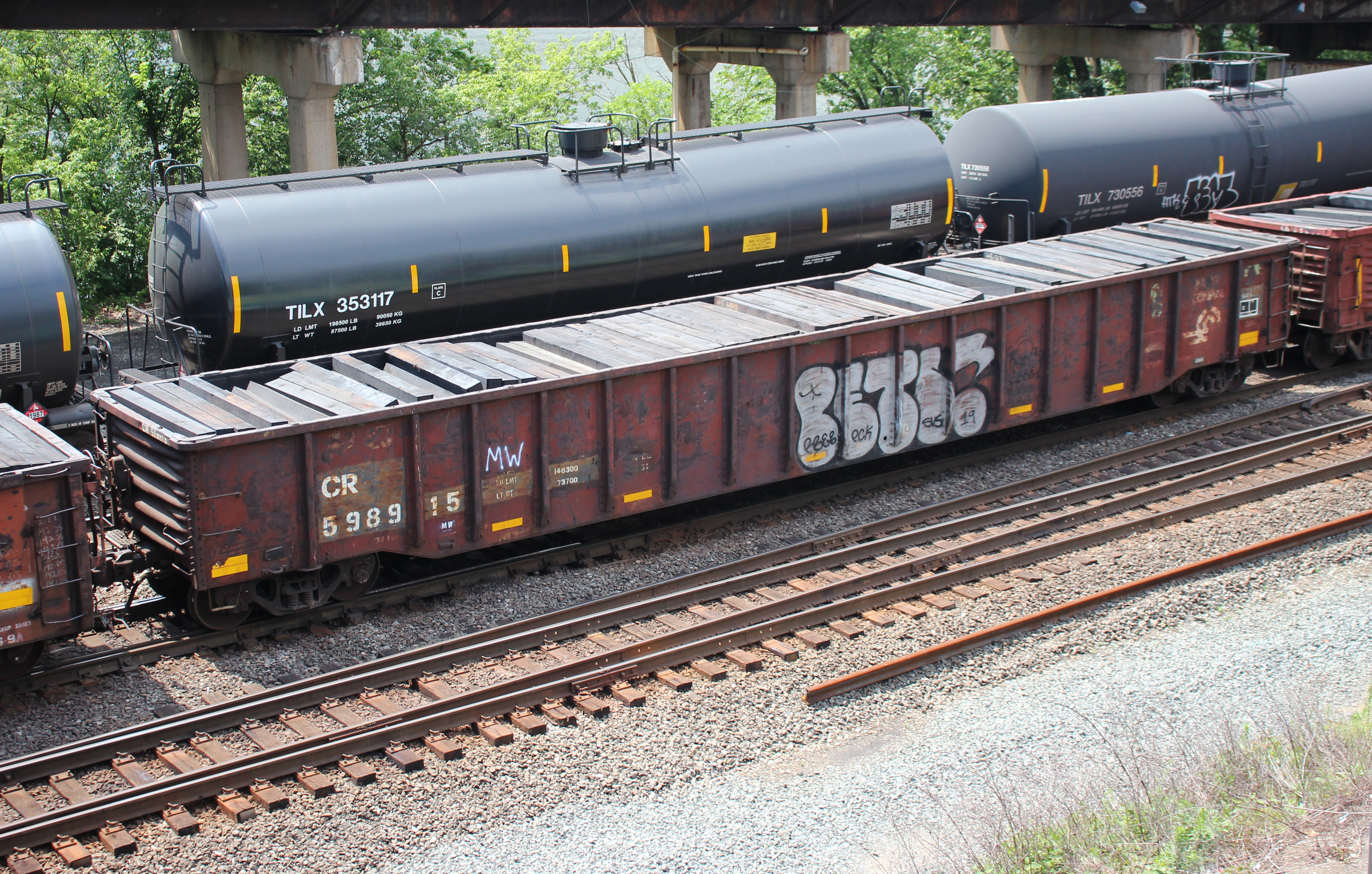 CR 598915 is seen in the consist of NS M3V at Baden (East Conway), PA on 6/28/25. Car is ex PC 598915 and was built 6-72 by Fruehauf.