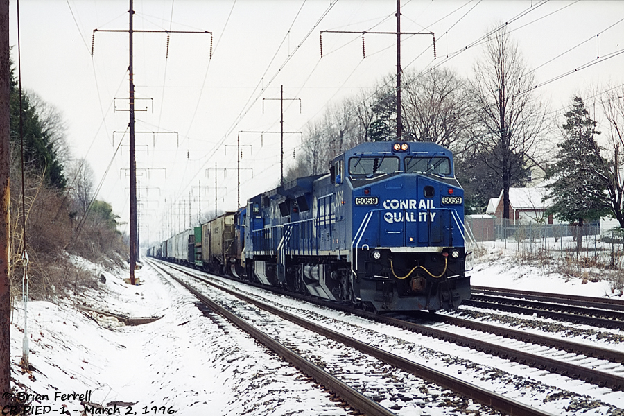At 2:56 on this Saturday afternoon, Conrail Dash-8s 6059 and 6090, along with GP38-2 8277, haul 123 cars (39x84 for 7,568 tons) southbound under wire towards Edgemoor, DE. The train came east on Conrail's Harrisburg Line to CP-River, hung the right at the wye, went up over the High Line in Philadelphia, and entered Amtrak at Phil interlocking. He will leave Amtrak at Bell interlocking, just north of Edgemoor.