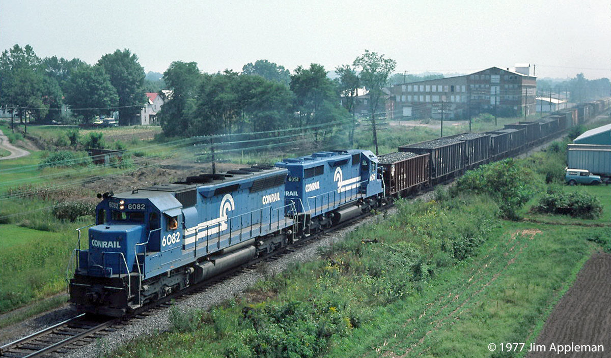 CR 6082 (ex-EL 3617) SD45 & CR 6051 (ex-CNJ 2512) SD35 lead the NAC (Northumberland-Altoona-Conway) west through Dewart, PA. This train ran out of Northumberland Yard to Lock Haven on the Buffalo Line, then over the Bald Eagle Branch to Tyrone and west on the Pittsburgh Line.