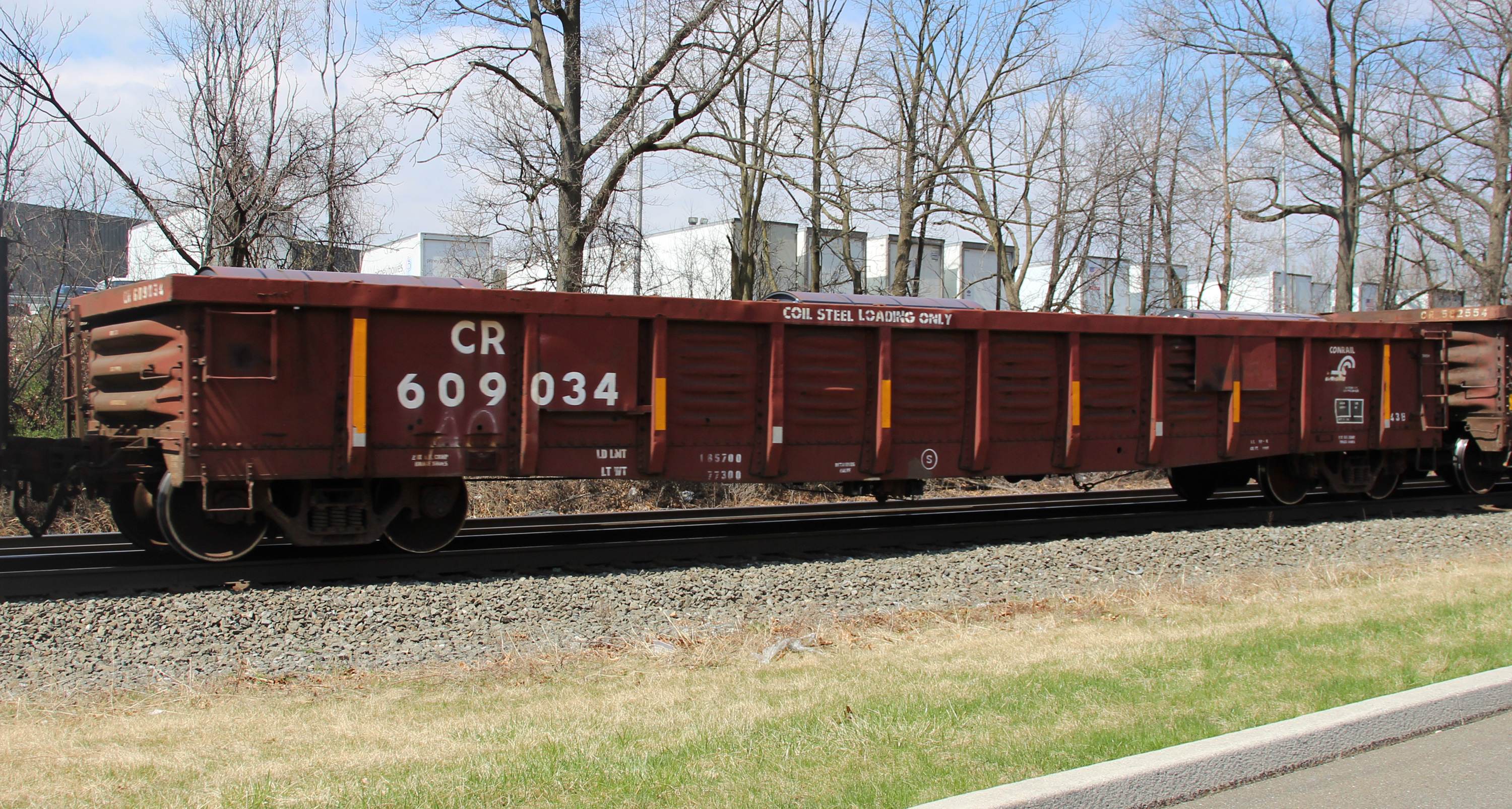 CR 609034 is seen in the consist of NS 38G at Laureldale, PA on 4/6/19. Car is ex CR 584122/PC 564914 and was built 1-70.
