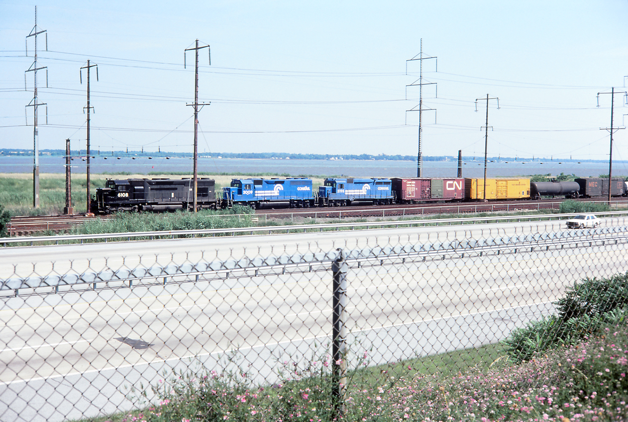 CR 6108, 3009, and 2195 are on a northbound parked just short of "BELL" interlocking, north of the yard at Edgemoor. (I-495 is in the foreground).