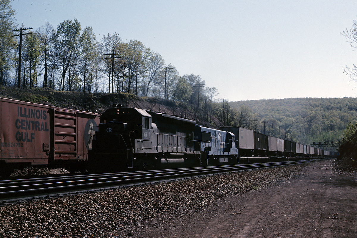 CR 21674 is sandwiched between a C&I hopper and the helpers on the end of a UBB coal train in Laureldale PA, August 1984