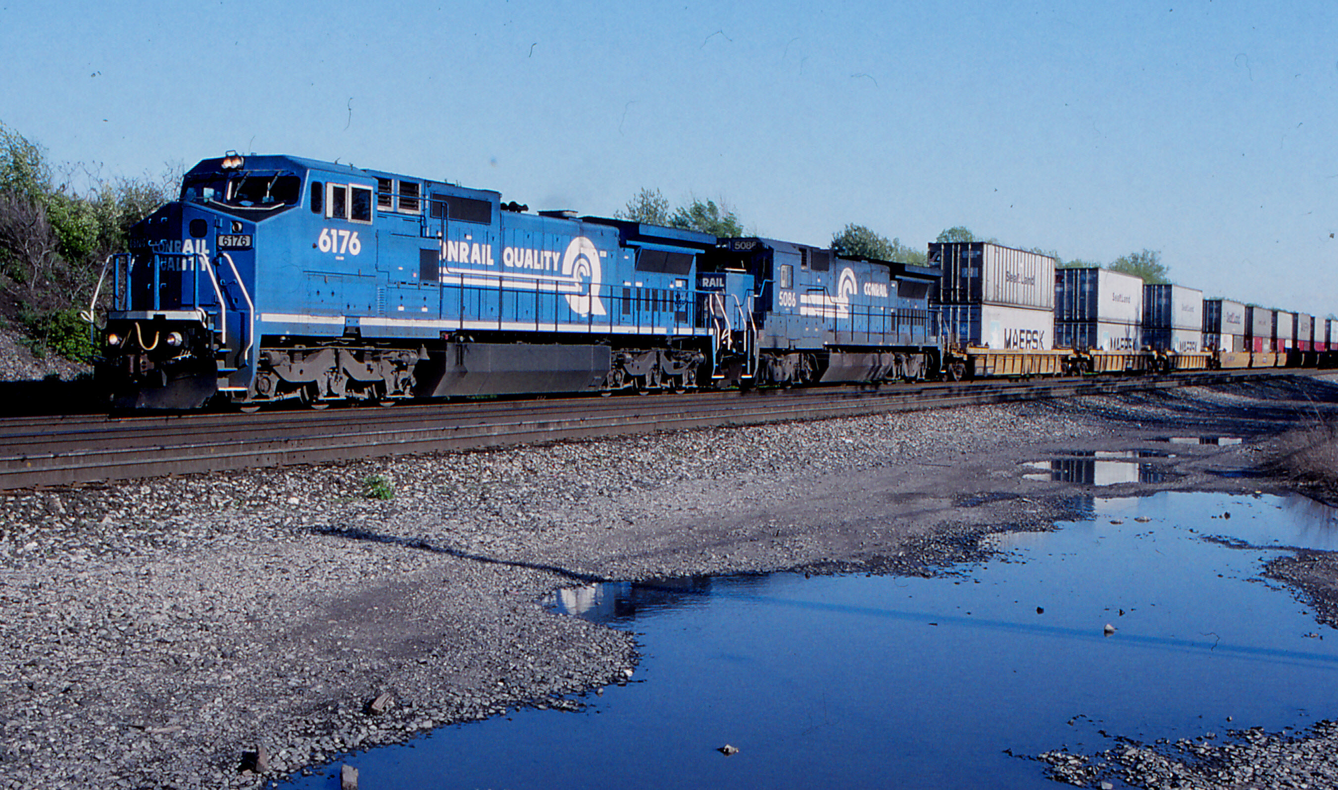 TV 554 passes Bayview behind a pair of 40's-in this case, GE C40-8W and B40-8, trailing 46 Sea Land platforms. They'll go to the D&H at Bison, then on to Jersey, changing to an NYSW crew at Binghamton. The CR power will not run through.