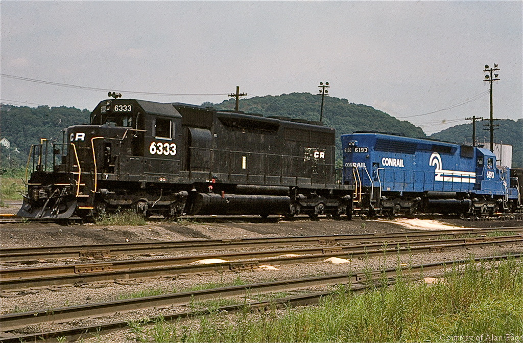 CR SD40 6333 (ex-PC 6080) with SD45 6193 (ex-PC) at Pitcairn, PA in August, 1978.