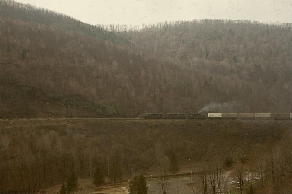 Vans west behind three EMD six axles (SD45, SD35(?) and SD40