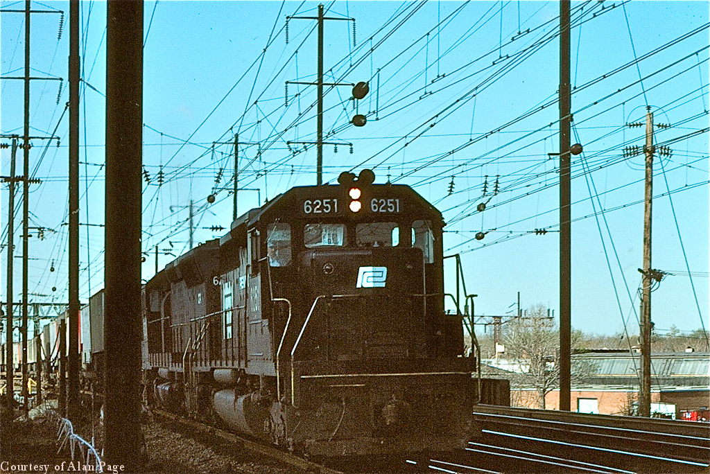 CR SD40 6251 coupled with an SD45 roar through Morrisville on track 1 with piggybacks in April, 1977.