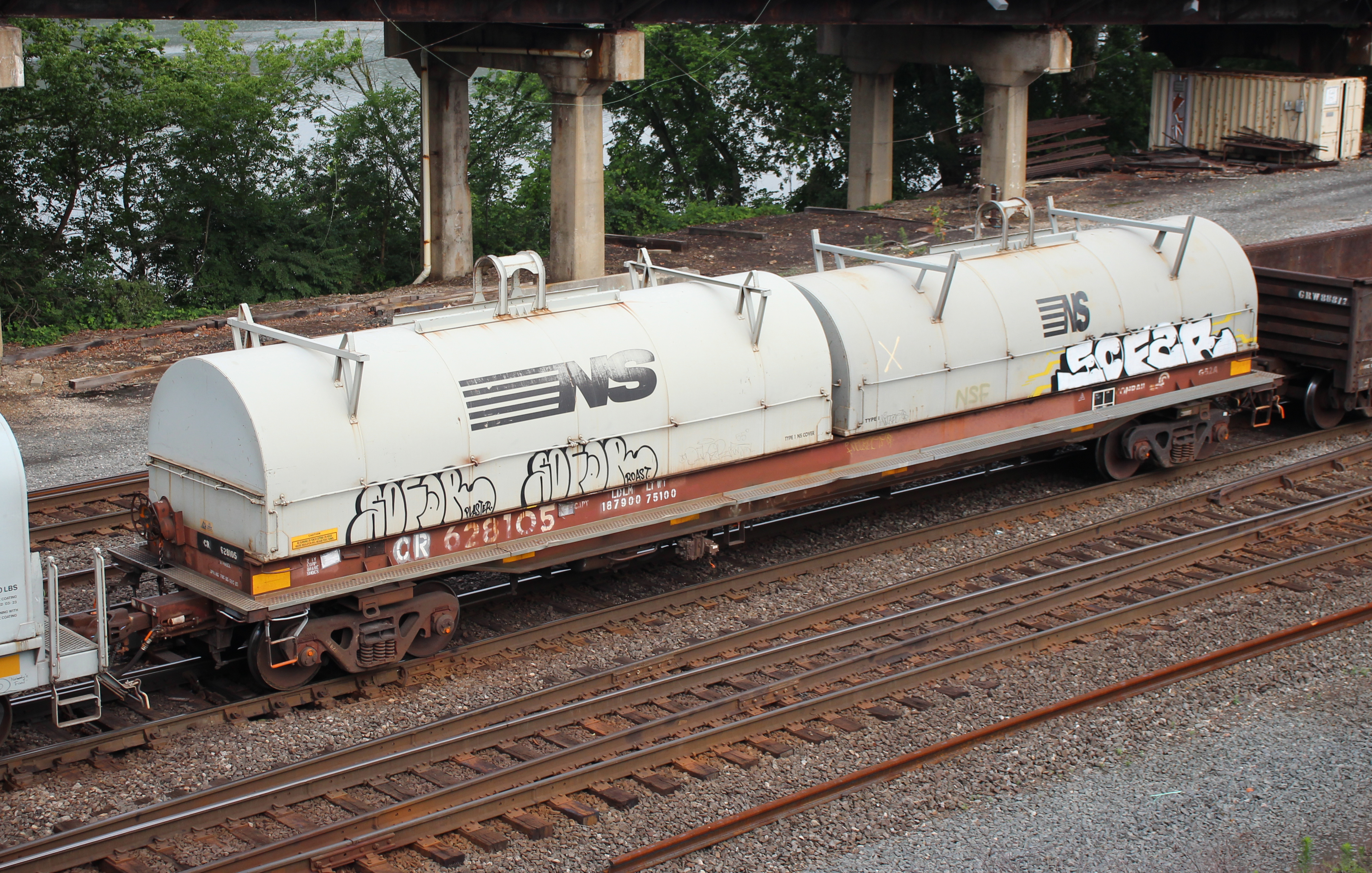 CR 628105 is seen in the consist of NS C35 at Baden (East Conway), PA on 6/28/25. Car was built 10-77 by Thrall as part of Job 698.