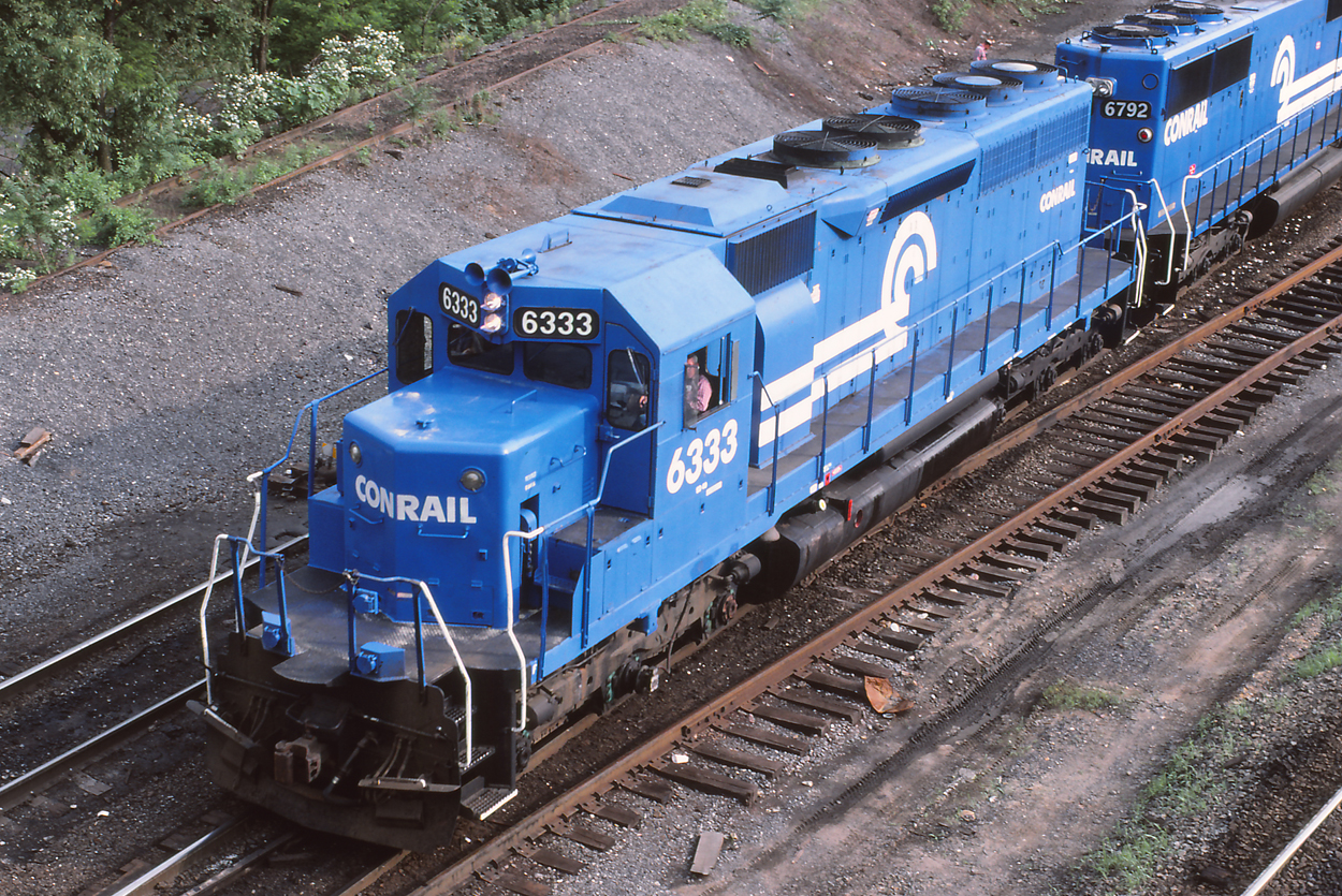 CR 6333 (former PC/PRR 6080) is head out on a train departing the west end of Enola yard, 5/22/87. It would be rebuilt to SD40-2R CR 6987 in September 1993, and renumbered to NS 3441 at the split.