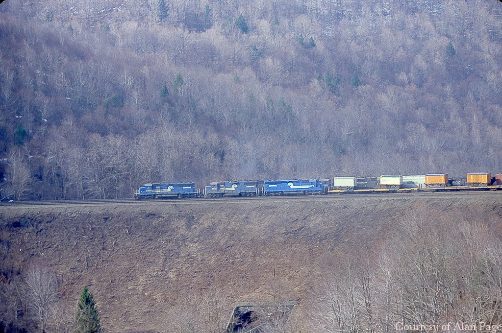 CR SD-40-2 6378 (1977-built) leads GP-38 7910 and SD-45 6177 racing piggybacks up Horseshoe Curve in March, 1981.