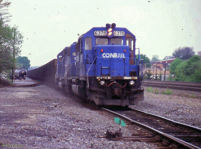 Conrail SD40-2 6378 is seen on the rear of a coal train heading up the Cresson Secondary at Cresson, PA in 1998.