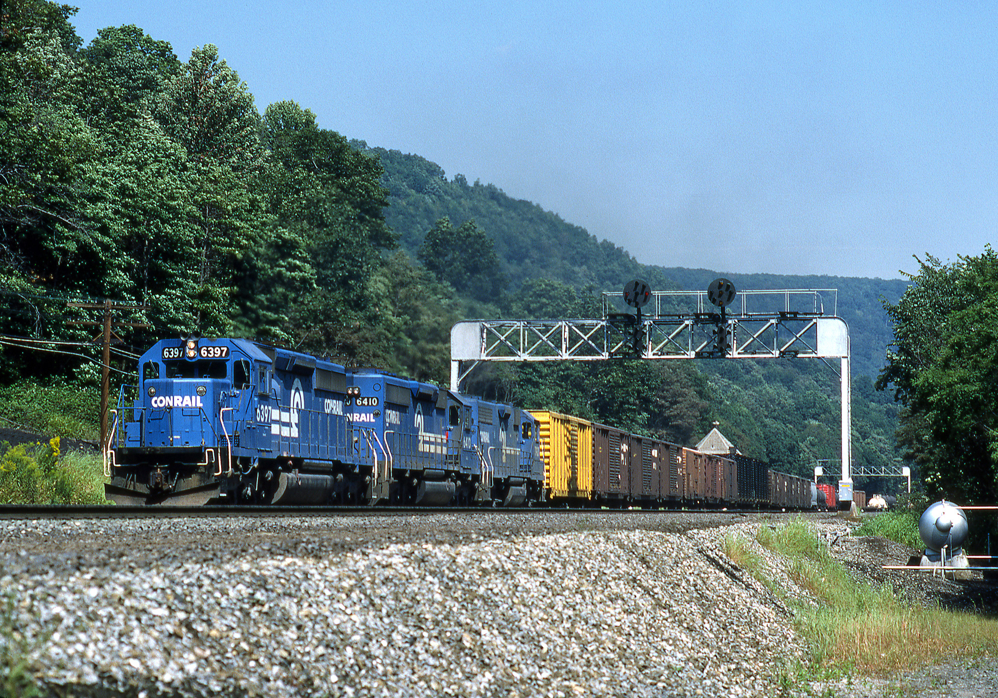 A westbound Conrail manifest climbs upgrade at MG Tower, PA on Sept. 8, 1984, led by SD40-2 No. 6397.