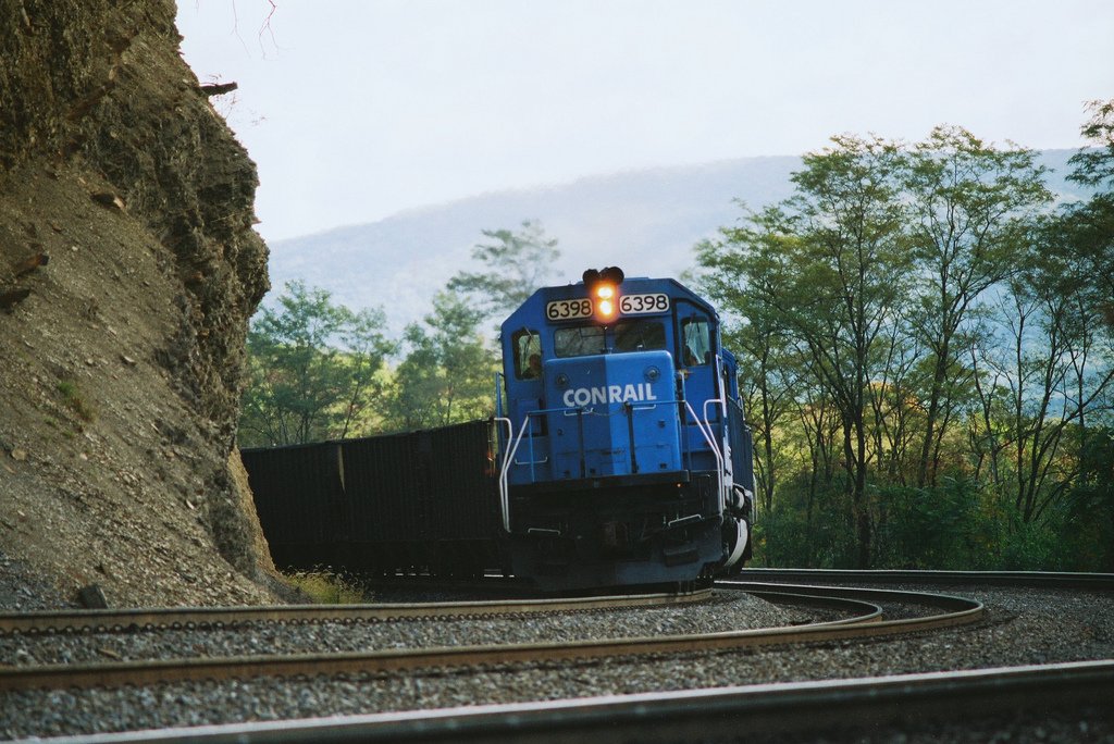 A westbound Conrail freight fights the East Slope grade rounding Wikes Curve behind SD40-2 No. 6398, on September 30, 1994. Doug Davidson photo with permission