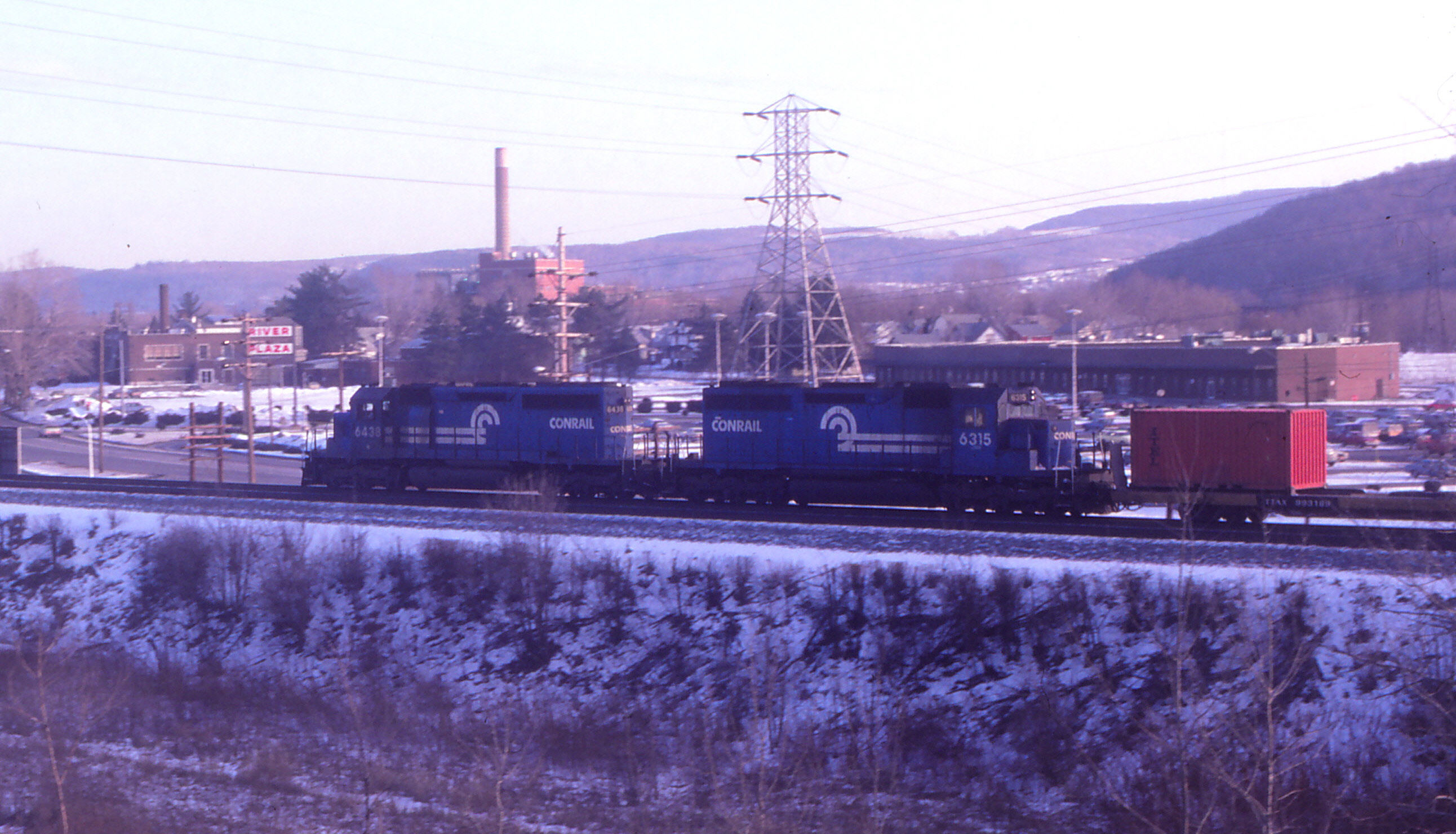A pair of SD40-2's lead what I'm guessing is TV 78 into Johnson City, rolling past River Plaza and what was then GE. The stack in the background is the NYSEG Goudy Station, destination for many a coal train on this line. It is actually on the Vestal Spur, a remnant of the DLW that is accessed at West BD.