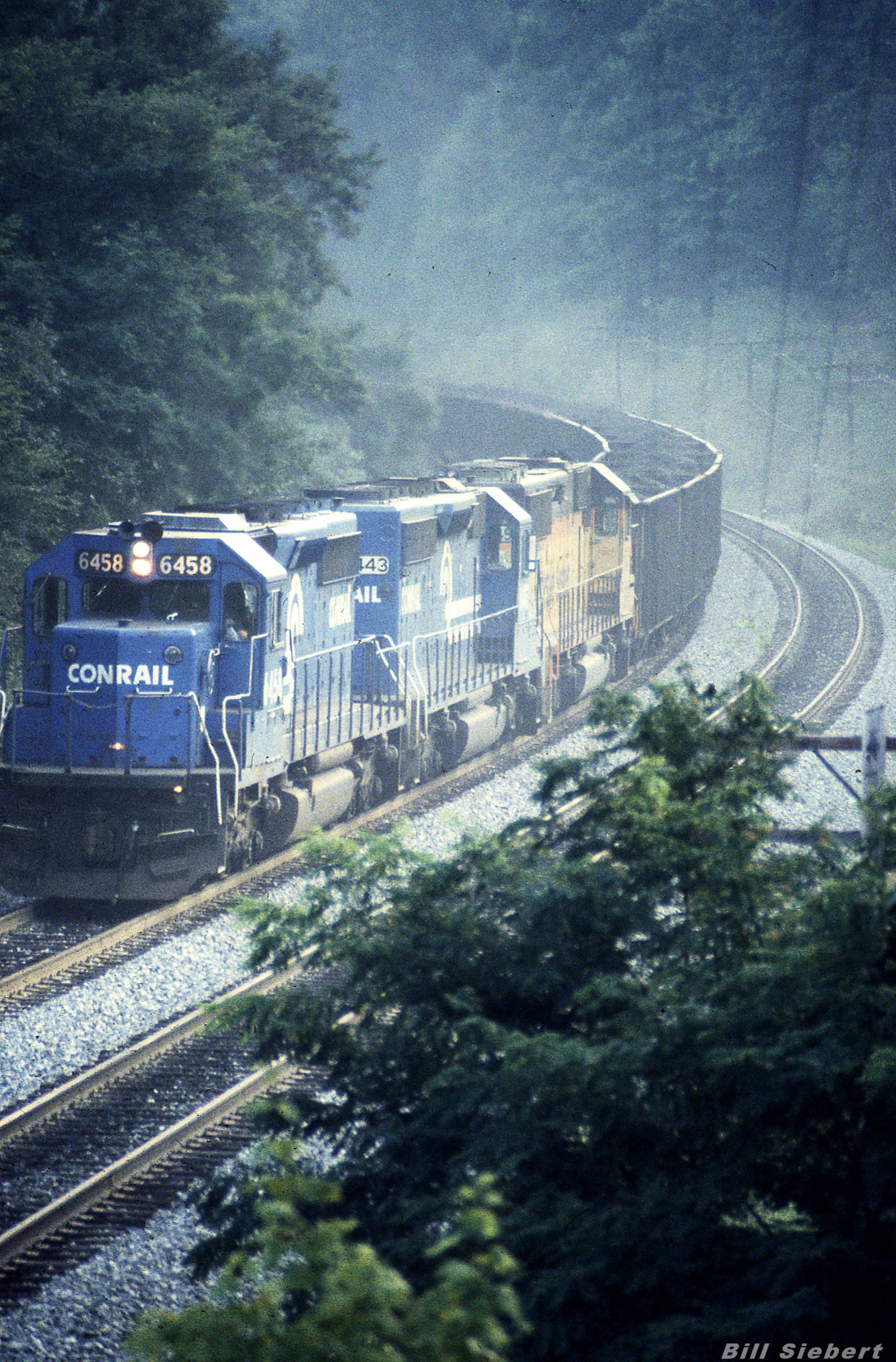 SD40-2s 6458 and 6443 and a third unit in what appears to be UP paint pull a coal train somewhere on the Monongahela Railroad in 1991.