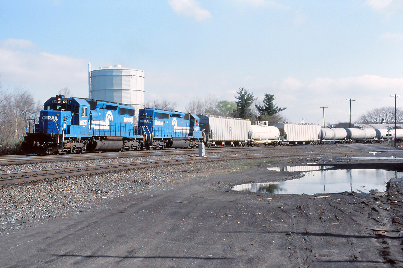 CR 6521 and 6438 lead a westbound departing town at CP BURN in Allentown, PA, on 4/8/89.