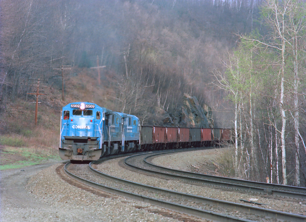 WNWS-6, a ballast train that is going to Pittsfield and will be left there, makes it's way up the east slope near Bancroft, MA. on April 26, 1986. After dropping the train, the power returned light to West Springfield.