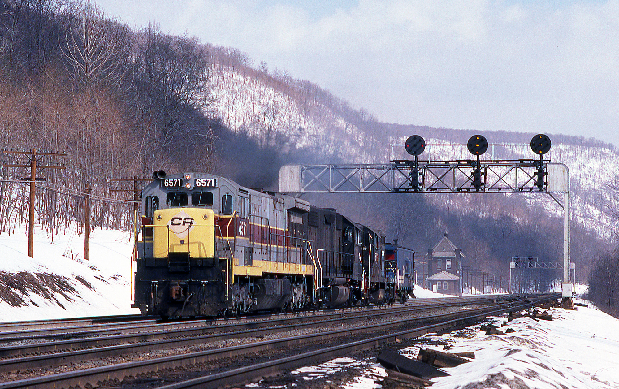 Since Conrail's early years, the term "patch job" has made me cringe. Up until Conrail, the only "patch jobs" I had ever seen were those done by SCL, when ACL and SAL merged. Compared to Conrail, those were an absolute class act. The former EL units seemed to get the best patches of all the Conrail predecessors. U33C No. 6571 wasn't one of them. It leads a cab light move upgrade at MG Tower, PA on 3/19/78.