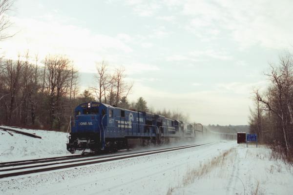 The 6597 leads NHSE at mile 130.2 near Bancroft, MA. on Dec. 8, 1984.