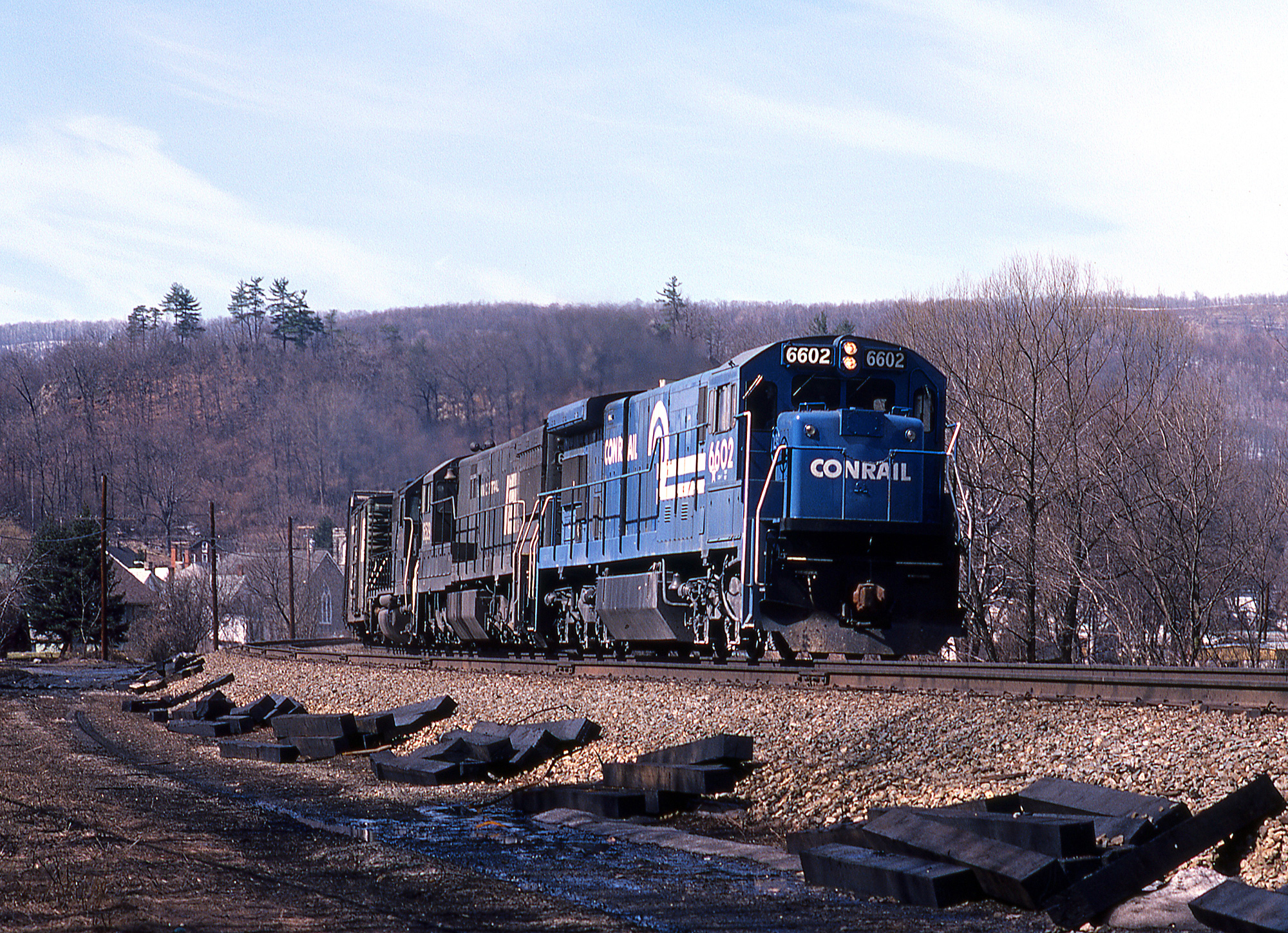 An eastbound manifest rolls through Mapleton, PA on 3/20/78, led by relatively new C30-7 No. 6602. New power and new crossties were signs of the times. Serious money was being invested.