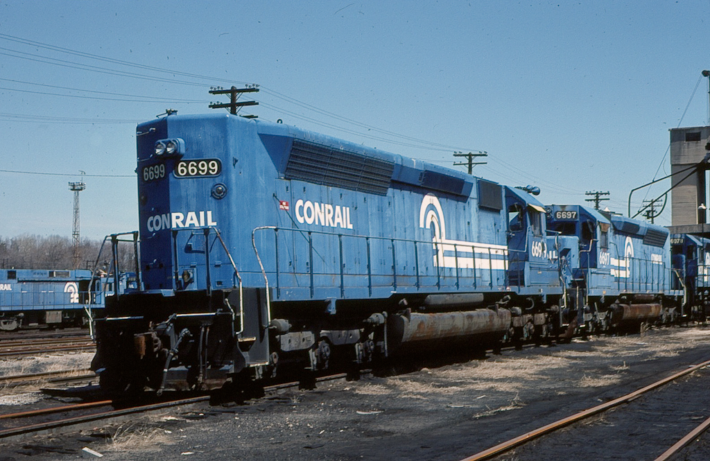 Looking tired and worn, CR SDP45 6699 (ex-EL 3668) and 6697 (ex-EL 3666) are paired up at Rutherford yard in April, 1984.
