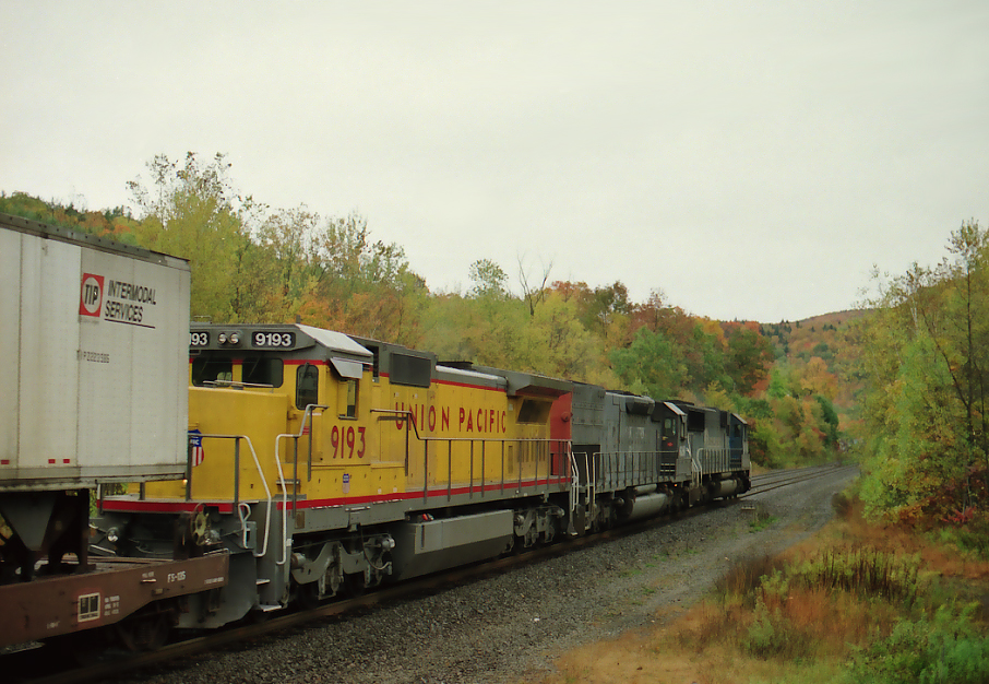 UP C40-8 9193 has the trail in SEPW at Chester, MA. on Oct. 10, 1998.