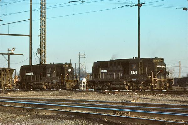 CR RSD-12 6869 works with sister unit 6866 in Morrisville yard. The old Alcos were worn out in March, 1977, but the turbocharged 251B prime movers sounded great.