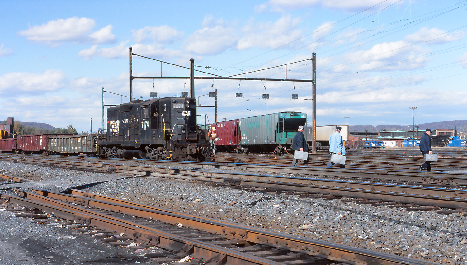 A crew with their classic "Grips" walks across (headed home?) while another yard job with GP9 CR 7174 prepares to pull ahead.