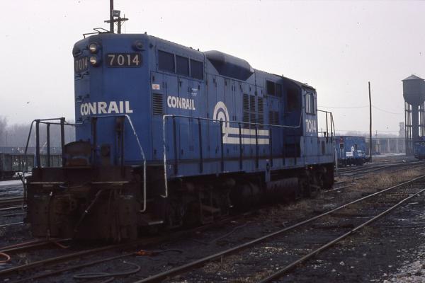 CR 7555, rebuilt from GP9 CR/PC/NYC 7408/NYC 6008, is seen at Shiremanstown, PA on 4/14/1990.