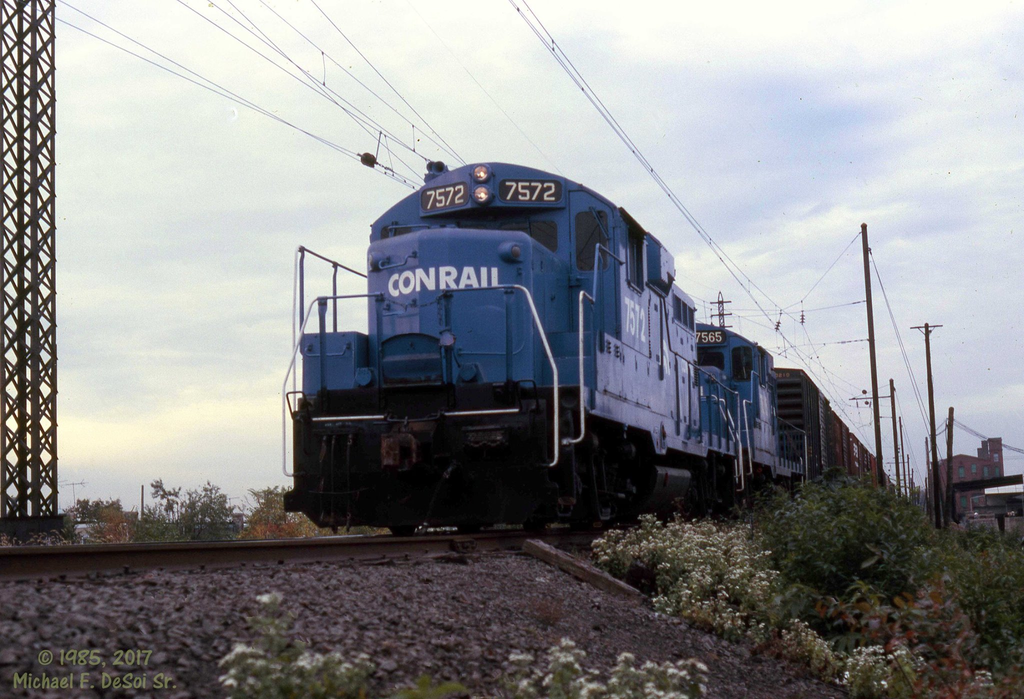 Two Conrail GP-10's #7572 & 7565 head a train on the Trenton Ave. branch near Frankford Junction in Philadelphia, PA. October 30, 1985.