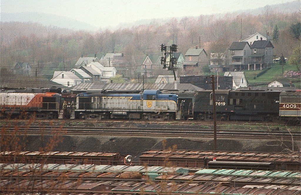 D&H RS-3's in orange and white and the traditional blue and gray paint schemes rest next to ex-PC RS-11 7619, now white-lined, at one of the Juniata shops deadlines in March, 1978.