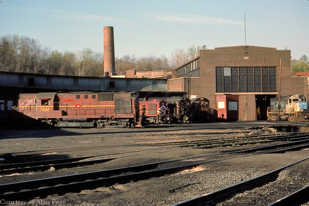 Alcos were common at Bethlehem in the spring of 1977. This day in April has CR Alco RS-11s 7642, 7641 and C420 2073, along with 2 SW-8Ms, at the roundhouse.