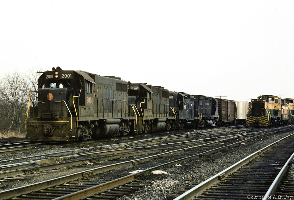 A four axle foursome takes a breather at Abrams yard on February 12, 1977. Former PRSL GP-38 2001 (CR 7661) rests in the lead, while sister-unit 2007 (CR 7667), GP9 7157, and C425 2423 follow with a line of mixed freight.