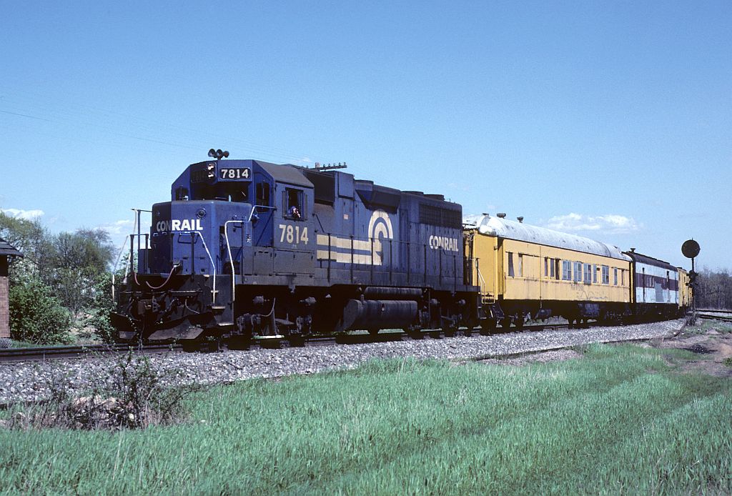 An interesting work train move going west on the Cleveland Line at Bayard. It had an engine on each end and an assortment of former PC and EL passenger turned work train cars. For the other end see :