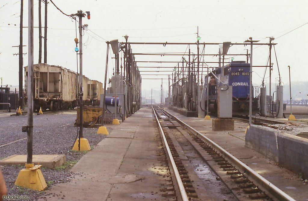 Conrail GP38-2 8045 is seen at the fuel and sanding facilities in Enola Yard in 1986.