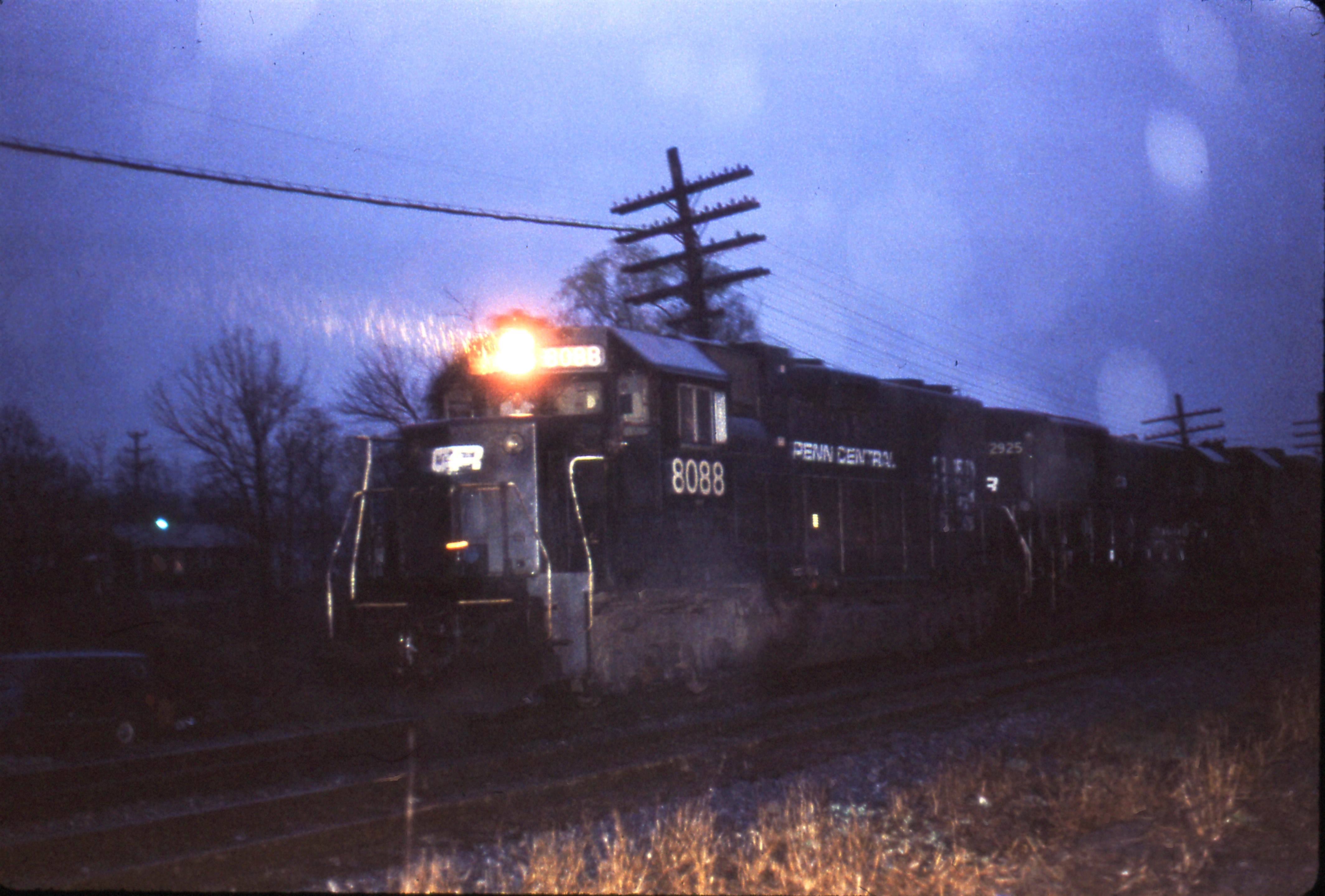 CR. GP38-2 #8088 (former PC) on a rainy evening at Harrisburg, PA.   It rained the entire day on September 15, 1979! Needless to say, even with my rain gear I got wet.  This is not a very good photo, but it exudes the rainy evening.  The show must go on!