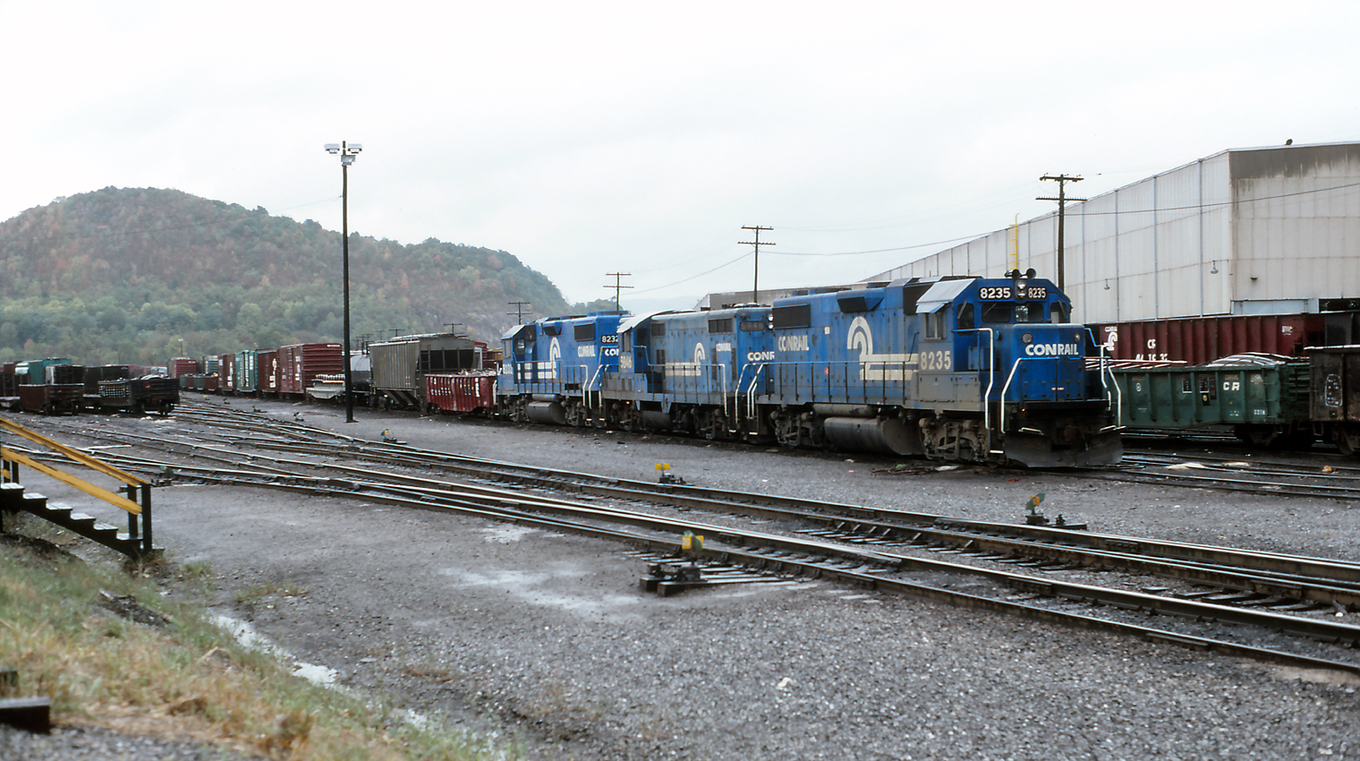 CR 8235, 5846, and 8232 with an assortment of cars, are parked in the yard at Hollidaysburg, PA, among a sea of Conrail freight equipment.