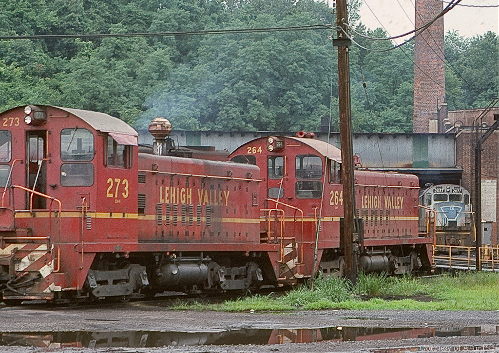 Former LV SW-8's 273 (CR 8687) and 264 (CR 8678) idle beside the Bethlehem turntable, while ex-L&HR C420 2077 rests at the roundhouse in August, 1977.