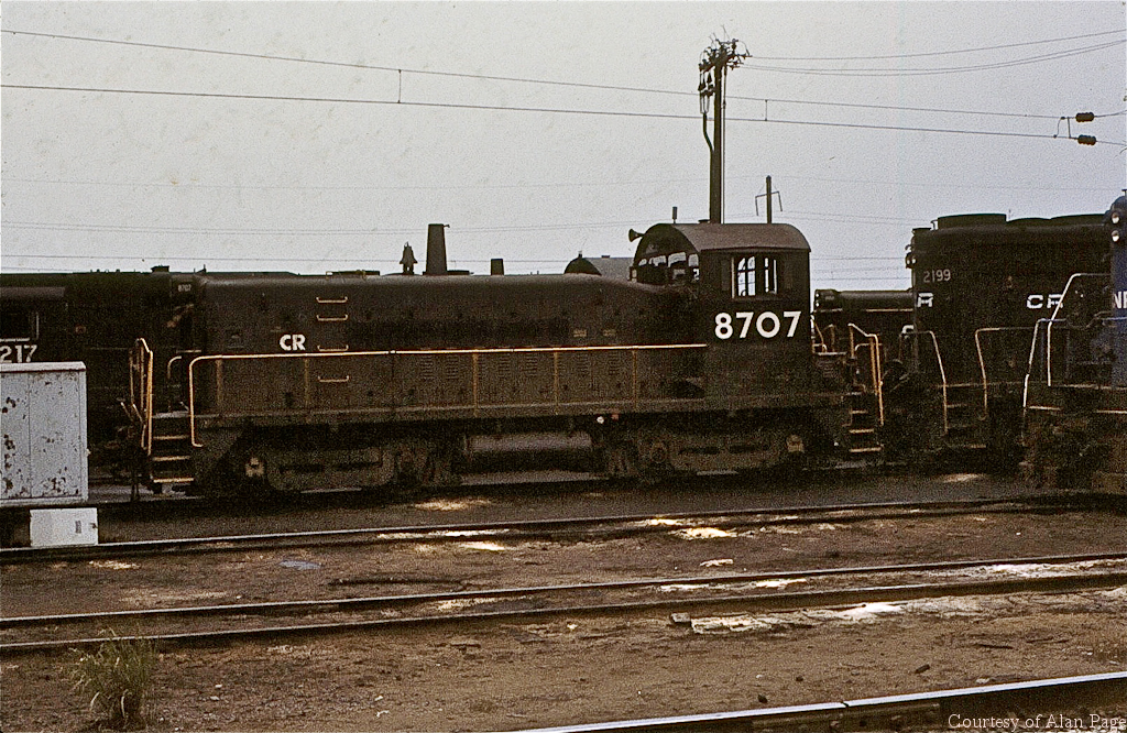 CR SW900 8707 (ex-RDG 1507) lined up with former PC GP30 2199 at Morrisville yard in February, 1979.