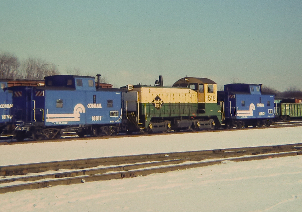 Former RDG SW900 1515 (CR 8715) is sandwiched between CR blue N4A class cabins 18811 (ex-RDG 94016) and 18810 (ex-RDG 94015) at Abrams in January, 1977.