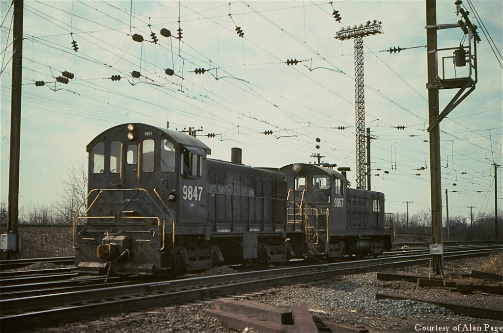 Alco T-6 CR 9847, one of six ex-PRR units, works Morrisville yard with PC SW-7 9067 in March, 1977.
