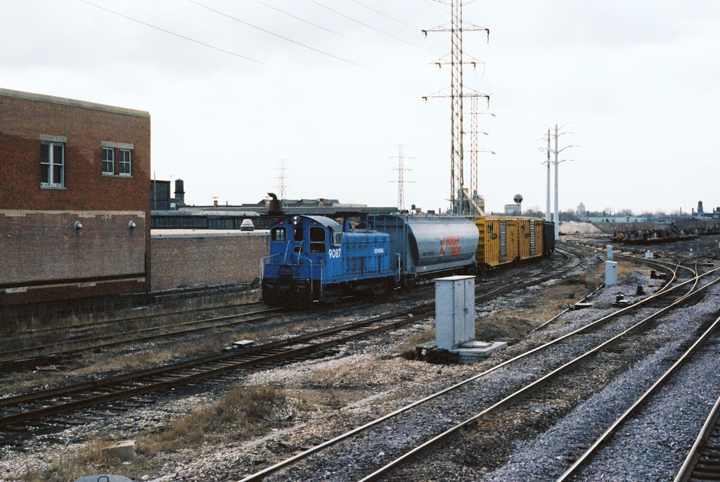 Conrail's "Panhandle Job" comes around the curve at Western Avenue (A-2) behind SW7 9087 in November 1982. Note the Wonder bread car behind the switcher. Doug Davidson photo with permission