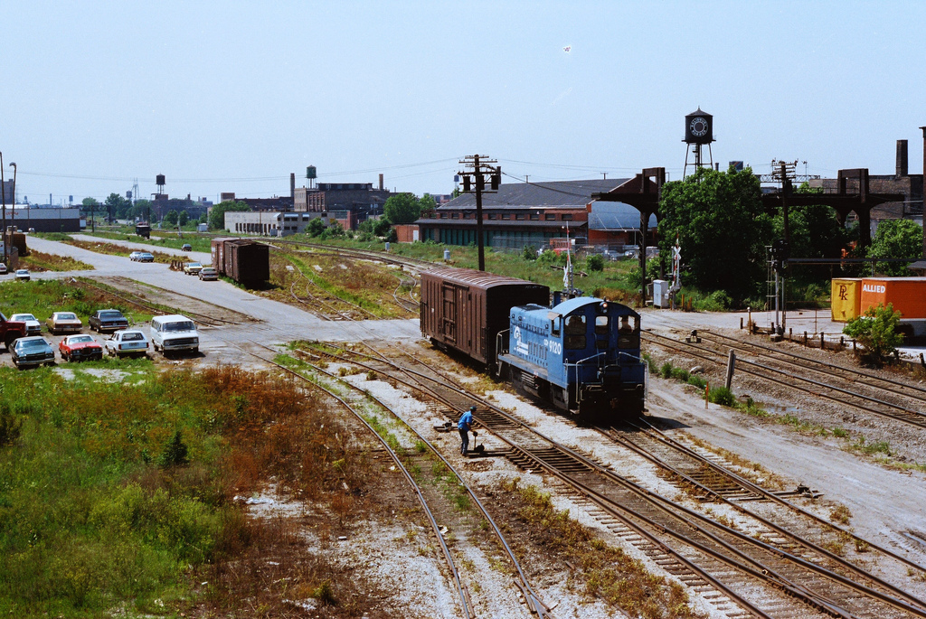 In a view looking west from the Halsted Street bridge, Conrail's Panhandle job with SW9 9120 is seen performing some switching in June 1982. This is the far east end (compass direction) of the PRR Panhandle (or far west end by timetable direction). The mains to the right of the switcher handled Milwaukee Road traffic into Union Station. Today this entire scene is now a parking lot. Doug Davidson photo with permission