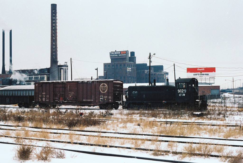Conrail SW9 No. 9129 works a local freight at Campbell's Soup Plant on the former PRR Panhandle in December 1981. Doug Davidson photo with permission