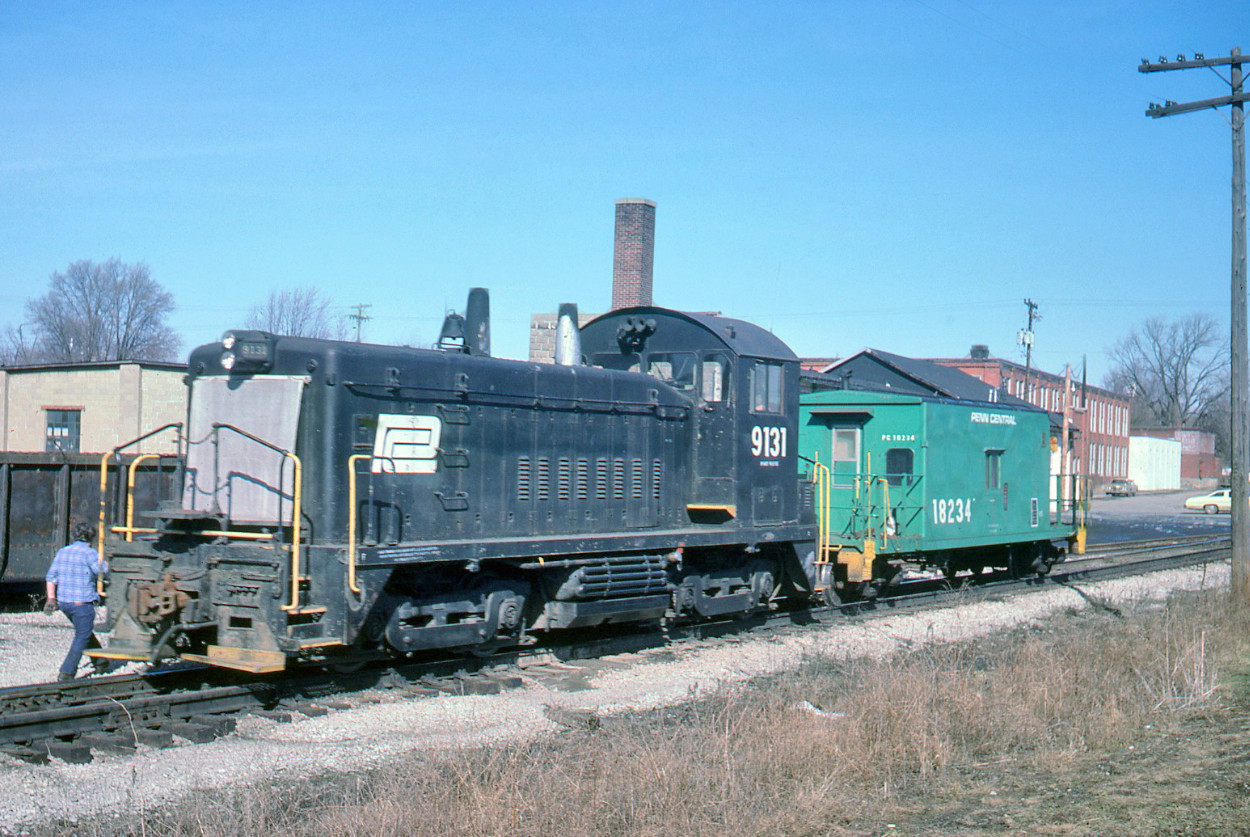 CR 9131, still in PC paint, and PC painted caboose 18234 is running caboose lite on the Michigan Branch(now the Marion Branch), as it prepares to take the connection to head southwest to Mexico, IN to work the Mexico Secondary in April 1976. Paul Lutz photo with permission