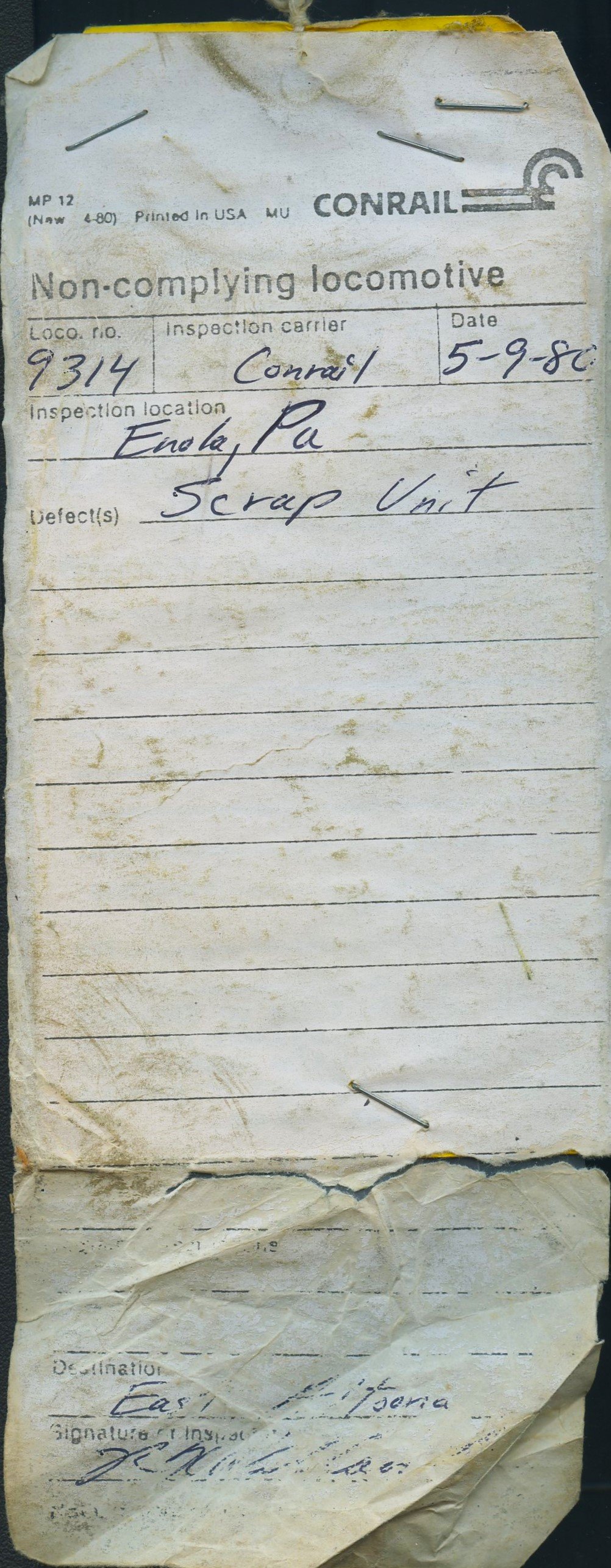 Conrail order tag MP-12 ordering the #9314 to scrap at East Altoona, May 9, 1980.  Refer to the photo of the #9314.  Interesting that the tag was printed in April 1980.