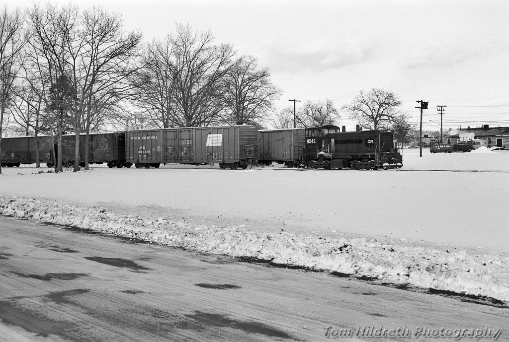 Conrail SW1500 9542 with a local working at Bradley Field airport in Windsor Locks, CT on 15 January 1978.
