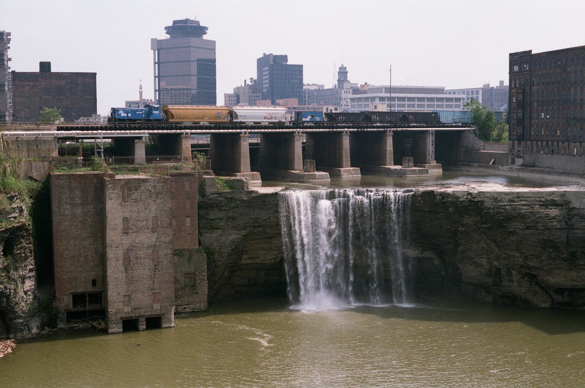 Horse Curve is great, but this location is outstanding!! Local RO-16 stopped on the Genesee River in Rochester on May 30, 1985. The covered hoppers are heading for Genesee Brewing Company on a spur on the eastside of the river.