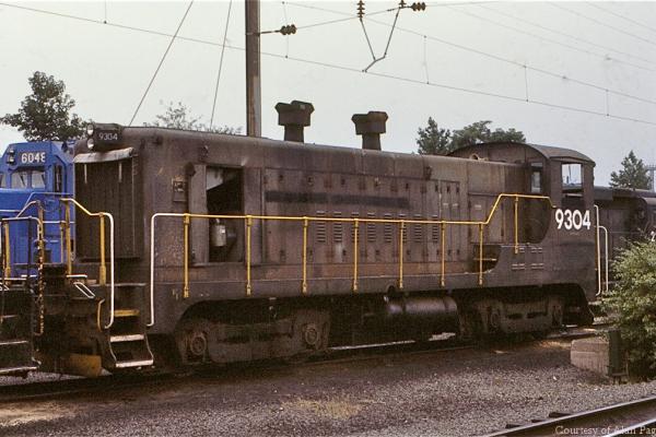 CR T-6 9844 rests along with RS-1 9902 in a line of retired Alcos at Morrisville yard in March, 1977. Alco T-6 9844, one of six PC class AS10a's, was the first in PC series 9844-9849.