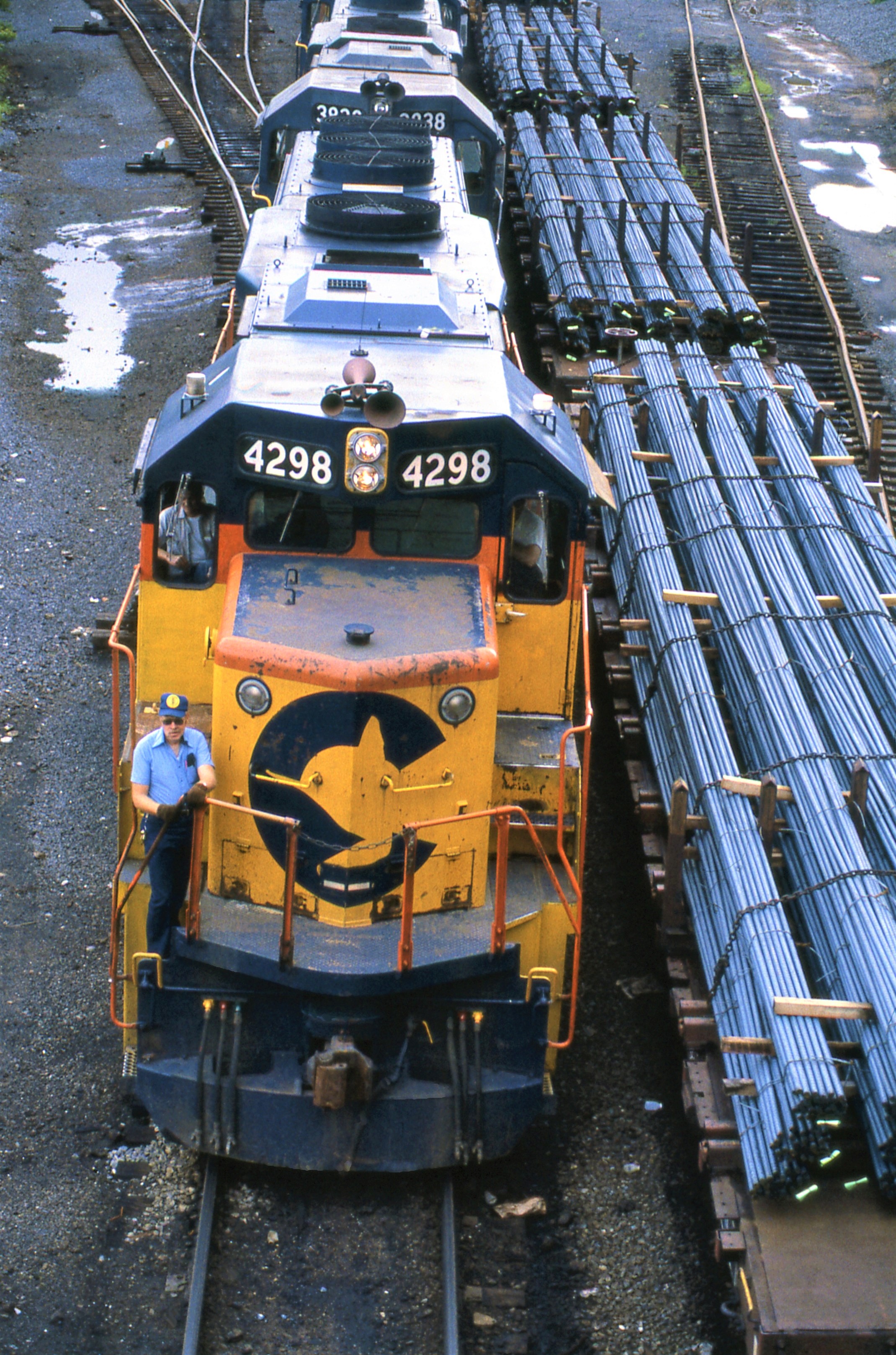 Chessie GP40-2 #4298, GP-38 #3938 leaving Enola, PA with freight on  April 28, 1984