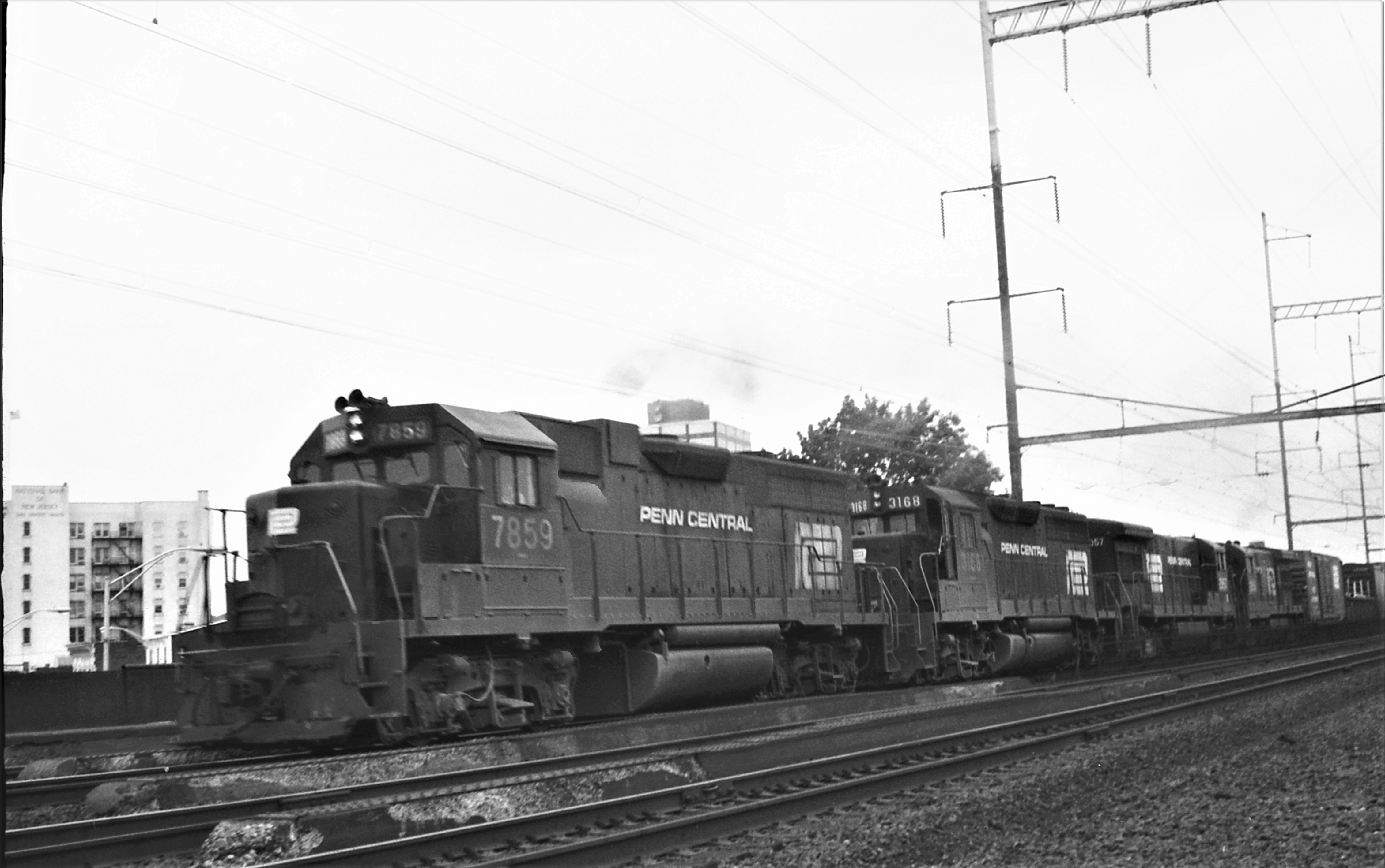 CR. Ex Pen Central GP38 #7859, GP40 #3168 & 2 GE units. Eastbound freight at New Brunswick, NJ. August 16, 1976. Photo taken with viewfinder 35mm using Kodak Pan-X black & white film.